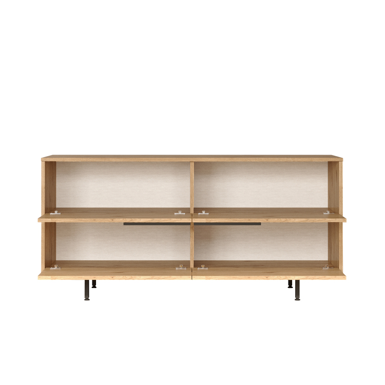 kombinuje moderní design a vysokou funkčnost. Čtyři plná dvířka poskytují praktický úložný prostor, který pomáhá udržet váš obývací pokoj čistý a organizovaný. Díky svému elegantnímu provedení a univerzálnímu stylu se komoda snadno začlení do jakéhokoli interiéru.
