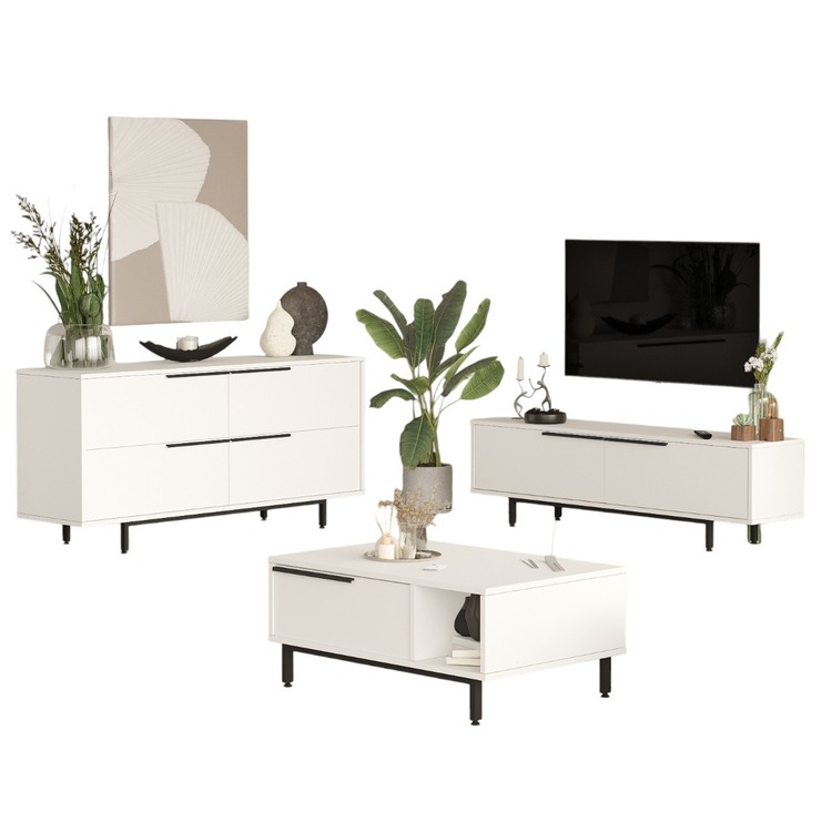 spojuje funkčnost a moderní design. Televizní stolek nabízí prostor pro elektroniku a multimediální zařízení, konferenční stolek je ideálním doplňkem pro odkládání občerstvení nebo dekorací a prostorná komoda poskytuje dostatek úložného prostoru pro organizaci vašich věcí. Díky preciznímu zpracování a elegantnímu vzhledu se tato sestava stane středobodem vašeho obývacího pokoje.