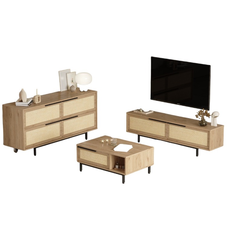 spojuje funkčnost a moderní design. Televizní stolek nabízí prostor pro elektroniku a multimediální zařízení, konferenční stolek je ideálním doplňkem pro odkládání občerstvení nebo dekorací a prostorná komoda poskytuje dostatek úložného prostoru pro organizaci vašich věcí. Díky preciznímu zpracování a elegantnímu vzhledu se tato sestava stane středobodem vašeho obývacího pokoje.