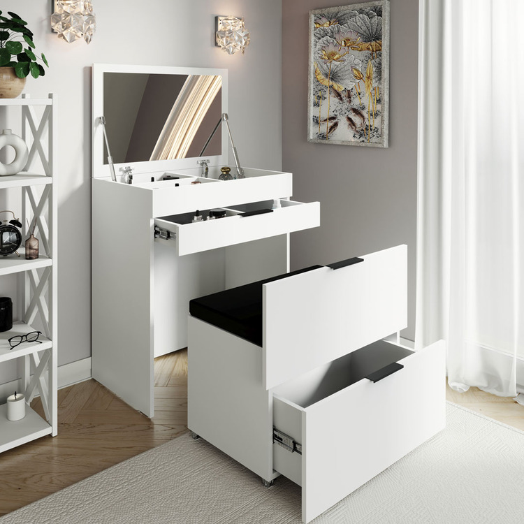 Zrcadlo ukryté ve výklopné horní desce umožňuje snadnou přeměnu z psacího strolíku na toaletní stolek. Součástí je vysouvatelná taburetka s čalouněným černým podsedákem pro pohodlné sezení. Úložný prostor zajistí dvě praktické zásuvky a prostor pod výklopným zrcadlem.