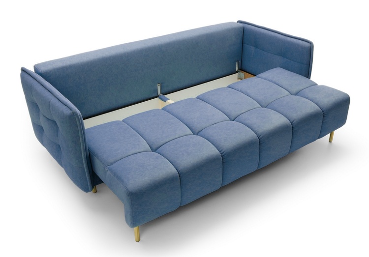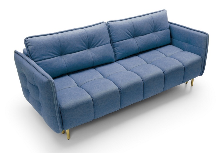 Praktická celočalouněná pohovka v elegantním provedení. Pohovka obsahuje úložný prostor a prostor na příležitostní spaní. Po rozložení je spací plocha 200 × 140 cm. Rozklad je snadný vysunutím sedací části a sklopením zadní opěrné části. Pohodlné sezení zaručují taštičkové pružiny Pocket spolu s vysoceelastickou PUR pěnou, opěrné polštáře jsou na volno. Nožky jsou v barvě zlaté. Barevné provedení pohovky je látka Castel 79 – modrá tmavá. (viz potah látky na menším obrázku)CASA 17007