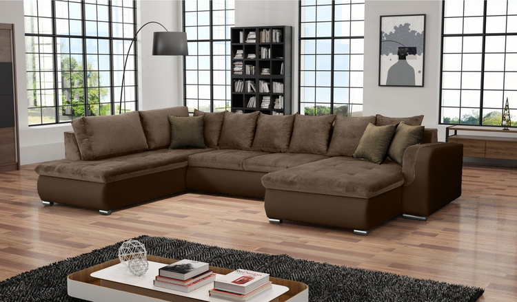 Praktická prostorná celočalouněná rohová sedačka do tvaru U. Netradiční a velmi moderní vzhled. Sedačka obsahuje prostor na příležitostní spaní. Po rozložení je spací plocha 285 × 135 cm. Rozklad je snadný, vysune se vozík s matrací do přední části. Pohodlné sezení zaručují vlnovcové pružiny spolu s PUR pěnou ( T30 ). Výška sedu je 41 cm, hloubka sedu 48 cm ( bez polštářů 63 cm ),výška sedačky bez polštářů 65 cm. Nožky jsou kovové pochromované. Barevné provedení – korpus ekokůže Madryt 128, sedací a opěrná část látka Orinoco 29 a dekorační polštářky Orinoco 29.CASA 41005