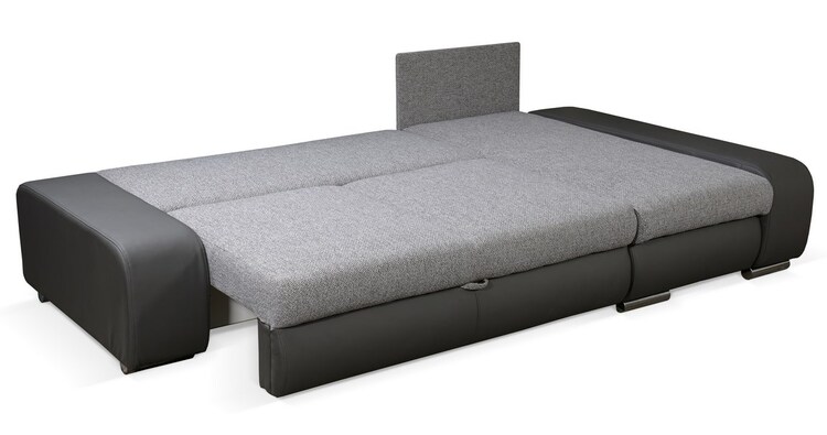 Rozkládací rohová sedačka. Netradiční a velmi moderní vzhled. Sedačka obsahuje úložný prostor a prostor na příležitostní spaní. Po rozložení je spací plocha 203 × 140 cm. Rozklad je snadný, vysune se matrace do přední části, zadní část se sklopí. Šířka je 255 cm, hloubka je 144 cm, celková výška je 90 cm, výška sedu je 43 cm, šířka područí 26 cm. Pohodlné sezení zaručují bonelové pružiny spolu s PUR pěnou. Sedačka je univerzální, dá se složit na obě strany. Barevné provedení – ekokůže Madryt 120 bílá a žíhaná látka Berlin 02 šedá.CASA 41013