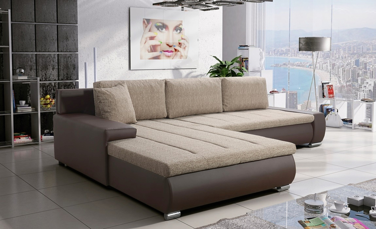 Praktická rohová sedačka. Netradiční a velmi moderní vzhled. Sedačka obsahuje úložný prostor a prostor na příležitostní spaní. Po rozložení je spací plocha 255 × 150 cm. Rozklad je snadný, pomocí automatu se vysune vozík s matrací do přední části. Nožky jsou z kovu. Pohodlné sezení zaručuje kvalitní PUR pěna spolu s vlnovcovými pružinami. Sedačka je univerzální, dá se složit na obě strany. Změna pozice strany je možná jednoduchým přemontováním (otočením) háků. Jeden polštářek je v ceně. Barevné provedení – ekokůže tmavě hmědá Madryt 124 a látka světle hnědá žíhaná Berlin 03.CASA 41026