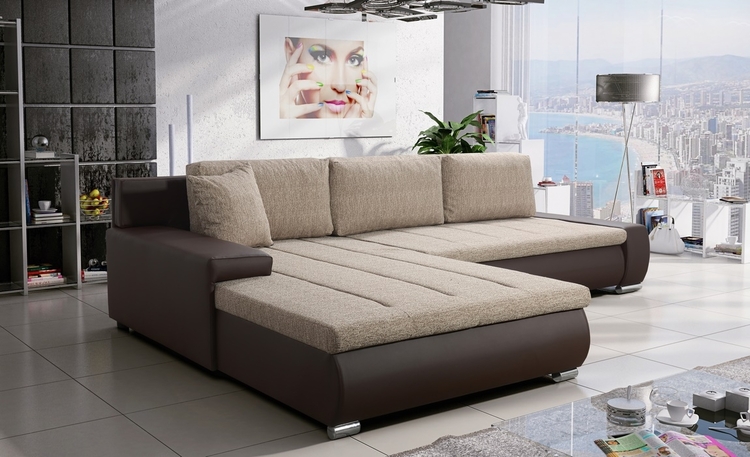Praktická rohová sedačka. Netradiční a velmi moderní vzhled. Sedačka obsahuje úložný prostor a prostor na příležitostní spaní. Po rozložení je spací plocha 255 × 150 cm. Rozklad je snadný, pomocí automatu se vysune vozík s matrací do přední části. Nožky jsou z kovu. Pohodlné sezení zaručuje kvalitní PUR pěna spolu s vlnovcovými pružinami. Sedačka je univerzální, dá se složit na obě strany. Změna pozice strany je možná jednoduchým přemontováním (otočením) háků. Jeden polštářek je v ceně. Barevné provedení – ekokůže tmavě hmědá Madryt 128 a látka světle hnědá žíhaná Berlin 03.CASA 41026