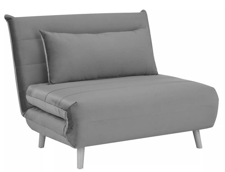 Rozkládací pohovka originálního vzhledu. Ve složeném stavu plní funkci pohovky a tak je vhodná do obývacího pokoje či malých obytných prostor, kde rádi využijete možnost posezení přes den a spaní na noc. Konstrukce je potažena látkou aksamit v šedé barvě (velvet 139),nožky jsou ze dřeva v... více informací o zboží