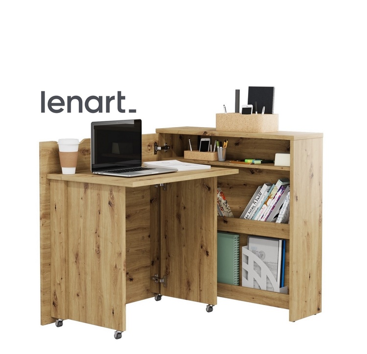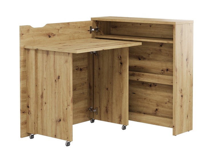 Rozkládací psací stůl v moderním a jednoduchém designu snadno složíte do komody a ušetříte tím spousty místa. Díky praktickým policím máte vše po ruce. Stůl je k dispozici ve dvou variantách – pravé nebo levé. Vyberte si ten, který lépe vyhovuje Vašim požadavkům. Kolečka umístěná pod bočními podpěrami usnadňují otevírání a zavírání stolu. Stůl je vyroben z lamina tloušťky 16mm, pracovní deska stolu z lamina tloušťky 22 mm. Maximální nosnost police je 5 kg, pracovní desky 3 kg. Šířka stolu po rozložení je 136 cm. Dodáváme v demontovaném stavu.CASA 73029