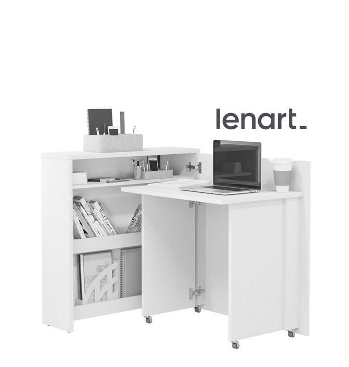 Rozkládací psací stůl v moderním a jednoduchém designu snadno složíte do komody a ušetříte tím spousty místa. Díky praktickým policím máte vše po ruce. Stůl je k dispozici ve dvou variantách – pravé nebo levé. Vyberte si ten, který lépe vyhovuje Vašim požadavkům. Kolečka umístěná pod bočními podpěrami usnadňují otevírání a zavírání stolu. Stůl je vyroben z lamina tloušťky 16mm, pracovní deska stolu z lamina tloušťky 22 mm. Maximální nosnost police je 5 kg, pracovní desky 3 kg. Šířka stolu po rozložení je 136 cm. Dodáváme v demontovaném stavu.CASA 73029
