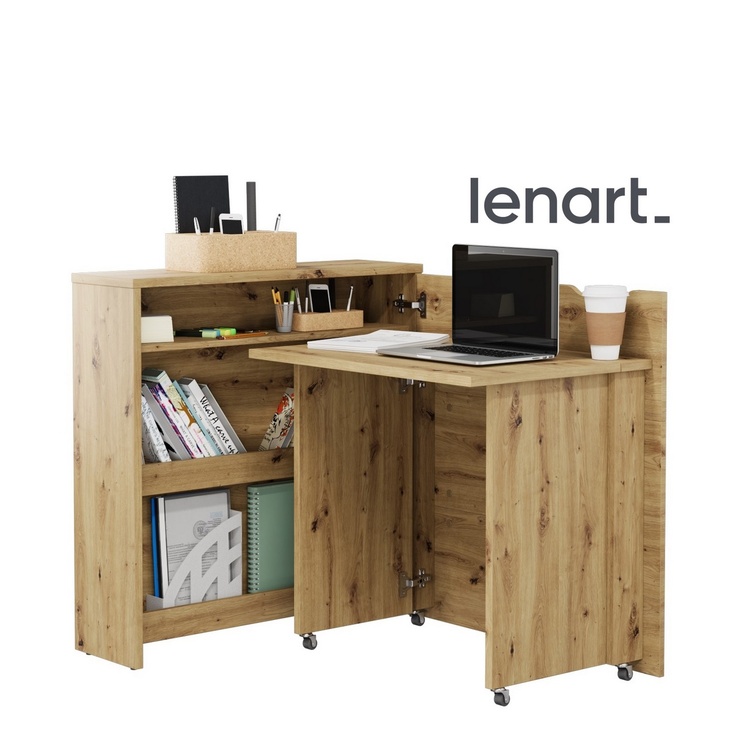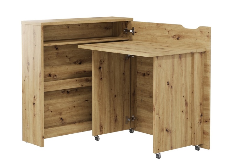 Rozkládací psací stůl v moderním a jednoduchém designu snadno složíte do komody a ušetříte tím spousty místa. Díky praktickým policím máte vše po ruce. Stůl je k dispozici ve dvou variantách – pravé nebo levé. Vyberte si ten, který lépe vyhovuje Vašim požadavkům. Kolečka umístěná pod bočními podpěrami usnadňují otevírání a zavírání stolu. Stůl je vyroben z lamina tloušťky 16 mm, pracovní deska stolu z lamina tloušťky 22 mm. Maximální nosnost police je 5 kg, pracovní desky 3 kg. Šířka stolu po rozložení je 136 cm. Dodáváme v demontovaném stavu.CASA 73029
