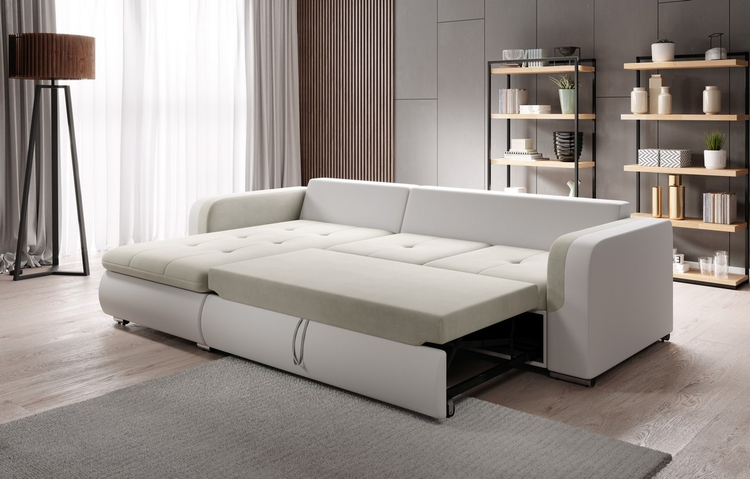 Praktická prostorná celočalouněná rohová sedačka. Netradiční a velmi moderní vzhled. Sedačka obsahuje prostor na příležitostní spaní. Po rozložení je spací plocha 217 × 134 cm. Rozklad je snadný, vysune se vozík s matrací do přední části. Pohodlné sezení zaručují vlnovcové pružiny spolu s PUR... více informací o zboží