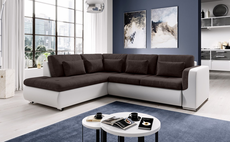 Praktická prostorná celočalouněná rohová sedačka do tvaru L. Netradiční a velmi moderní vzhled. Sedačka obsahuje prostor na příležitostní spaní. Po rozložení je spací plocha 195 × 134 cm. Rozklad je snadný, vysune se vozík s matrací do přední části. Pohodlné sezení zaručují vlnovcové pružiny spolu s PUR pěnou ( T30 ). Výška sedu je 42 cm, hloubka sedu 48 cm, výška sedačky bez polštářů 67 cm. Nožky jsou kovové pochromované. Barevné provedení – korpus ekokůže Madryt 120, sedací a opěrná část látka Kronos 06, dekorační polštářky Kronos 06.CASA 41005