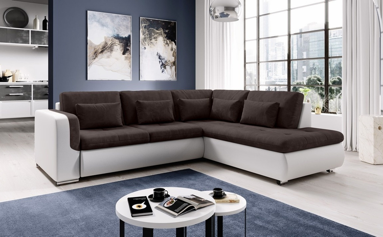 Praktická prostorná celočalouněná rohová sedačka do tvaru L. Netradiční a velmi moderní vzhled. Sedačka obsahuje prostor na příležitostní spaní. Po rozložení je spací plocha 195 × 134 cm. Rozklad je snadný, vysune se vozík s matrací do přední části. Pohodlné sezení zaručují vlnovcové pružiny spolu s PUR pěnou ( T30 ). Výška sedu je 42 cm, hloubka sedu 48 cm, výška sedačky bez polštářů 67 cm. Nožky jsou kovové pochromované. Barevné provedení – korpus ekokůže Madryt 120, sedací a opěrná část látka Kronos 06, dekorační polštářky Kronos 06.CASA 41005