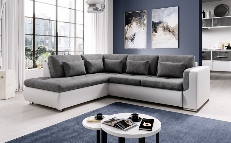 Praktická prostorná celočalouněná rohová sedačka do tvaru L. Netradiční a velmi moderní vzhled. Sedačka obsahuje prostor na příležitostní spaní. Po rozložení je spací plocha 195 × 134 cm. Rozklad je snadný, vysune se vozík s matrací do přední části. Pohodlné sezení zaručují vlnovcové pružiny spolu s PUR pěnou ( T30 ). Výška sedu je 42 cm, hloubka sedu 48 cm, výška sedačky bez polštářů 67 cm. Nožky jsou kovové pochromované. Barevné provedení – korpus ekokůže Madryt 120, sedací a opěrná část látka Kronos 34, dekorační polštářky Kronos 34.CASA 41005