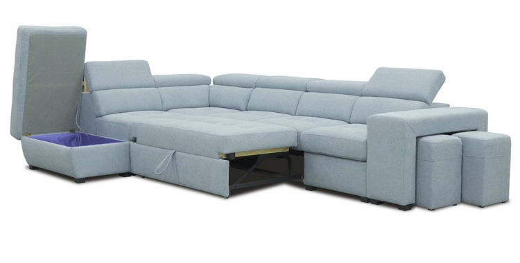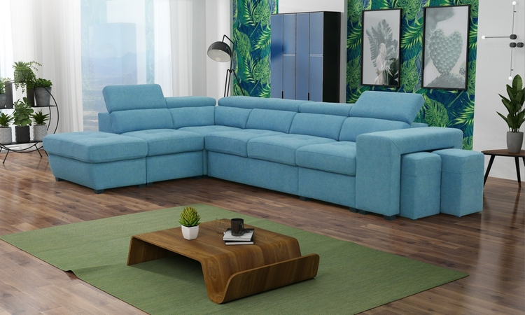 Elegantní celočalouněná rozkládací rohová sedačka ve tvaru L s regulovatelnými opěrkami. Rozkládá se vysunutím přední části pomocí automatu na pístech ( viz. obrázky ). Spací plocha po rozložení je 188 × 115 cm. Sedačka obsahuje také dva taburety schované pod boční opěrkou a praktický úložný prostor. Díky kombinaci vlnovcových a bonelových pružin s HR PUR pěnou zaručuje sedačka komfortní pohodlí. Hloubka sedu je 55 cm, výška sedu 46 cm. Barevné provedení – látka Ocean 18.CASA 41038