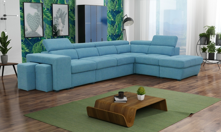 Elegantní celočalouněná rozkládací rohová sedačka ve tvaru L s regulovatelnými opěrkami. Rozkládá se vysunutím přední části pomocí automatu na pístech ( viz. obrázky ). Spací plocha po rozložení je 188 × 115 cm. Sedačka obsahuje také dva taburety schované pod boční opěrkou a praktický úložný prostor. Díky kombinaci vlnovcových a bonelových pružin s HR PUR pěnou zaručuje sedačka komfortní pohodlí. Hloubka sedu je 55 cm, výška sedu 46 cm. Barevné provedení – látka Ocean 18.CASA 41038