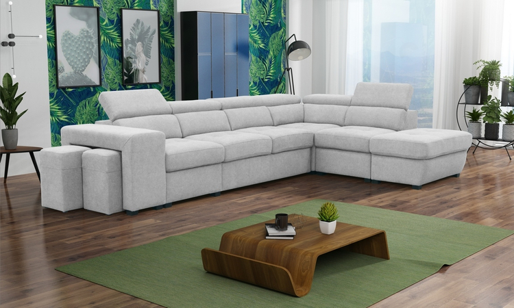 Elegantní celočalouněná rozkládací rohová sedačka ve tvaru L s regulovatelnými opěrkami. Rozkládá se vysunutím přední části pomocí automatu na pístech ( viz. obrázky ). Spací plocha po rozložení je 188 × 115 cm. Sedačka obsahuje také dva taburety schované pod boční opěrkou a praktický úložný... více informací o zboží