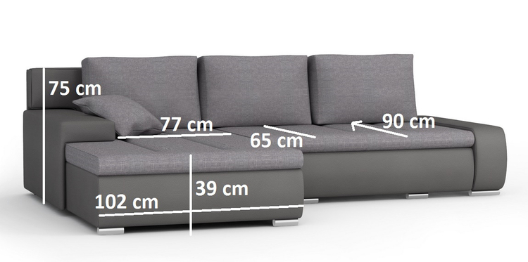 Praktická rohová sedačka. Netradiční a velmi moderní vzhled. Sedačka obsahuje úložný prostor a prostor na příležitostní spaní. Po rozložení je spací plocha 206 × 149 cm. Výška sedáku je 39 cm. Rozklad je snadný, pomocí automatu se vysune vozík s matrací do přední části. Nožky jsou z pochromovaného kovu. Pohodlné sezení zaručuje kvalitní PUR pěna ( T30 ) spolu s vlnovcovými pružinami. Sedačka je univerzální, dá se složit na obě strany. Postup při objednání: Nejdříve si zvolte potah u sedací a opěrné části ( viz potah ) a následně potah u spodní a zadní části – korpusu.CASA 41024