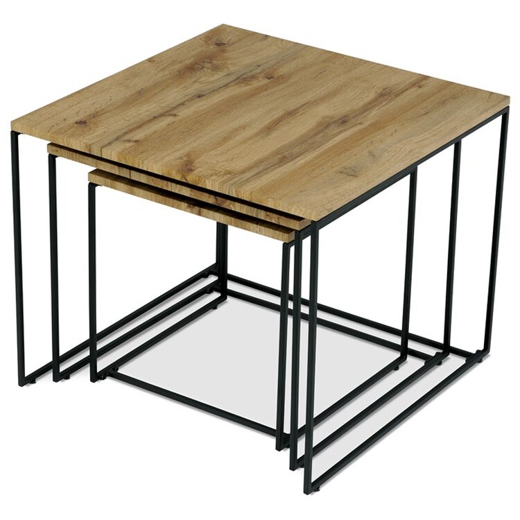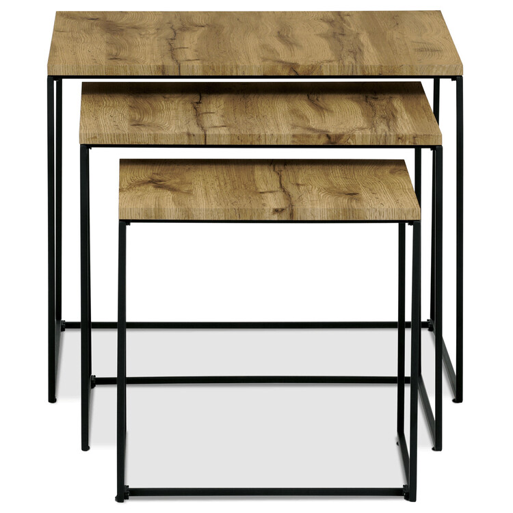 Tato sada tří konferenčních stolků, vyrobená uznávanou značkou Autronic, se stává nezbytným doplňkem každého prostoru, který si potrpí na styl i praktičnost. Díky robustní desce ze středně husté dřevovláknité desky (MDF) zdobené dubovým dekorem vnese tato sestava do obývacích pokojů, kanceláří nebo konferenčních prostor hřejivou a příjemnou atmosféru. Čtvercový tvar horní desky elegantně vyvažuje industriální estetiku s univerzálností, takže je ideální volbou pro různé motivy interiéru.Pod bohatě strukturovaným povrchem se nacházejí černé kovové nohy v kruhovém uspořádání základny, které poskytují neochvějnou oporu a odolnost. Tato konstrukční volba nejenže zvyšuje vizuální přitažlivost stolu výrazným kontrastem, ale také zajišťuje stabilitu na různých typech podlah. Industriální styl těchto stolů přináší ostrý a zároveň sofistikovaný vzhled, díky čemuž dokonale odpovídají současnému vkusu, který se přiklání k minimalismu s charakterem.Jako součást řady Autronic je tato sada navržena tak, aby vedle estetických předností poskytovala i pohodlí. Povrchy se pozoruhodně snadno udržují, stačí je jen otřít, aby vypadaly bezchybně. Tato praktická vlastnost v kombinaci s odolností a přizpůsobivostí soupravy ji činí stejně vhodnou pro rušné rodinné domy jako pro kancelářské prostory s vysokým provozem. Tyto konferenční stolky nabízejí harmonickou kombinaci funkčnosti a elegance.