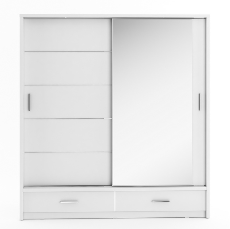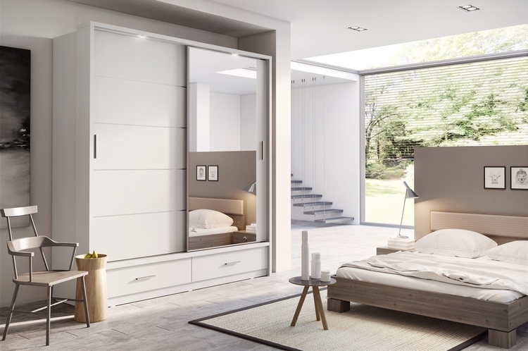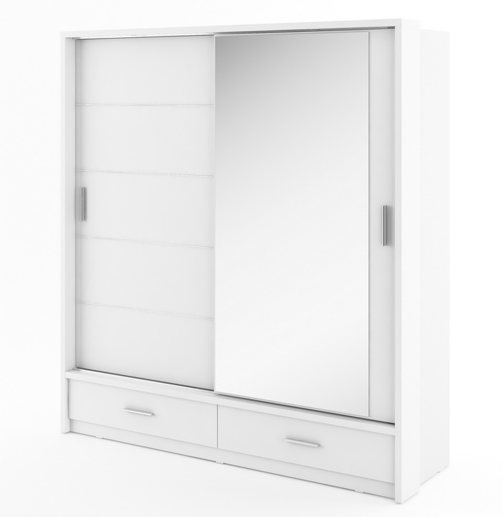 Šatní skříň dvoudveřová s posuvnými dveřmi v moderním provedení. Dole jsou dvě zásuvky. Korpus a dveře jsou z kvalitního LTD v bílé matné barvě. Jedny dveře jsou osazeny zrcadlem. Hrany u skříně jsou ohraničeny ABS páskou. LED osvětlení je v ceně. Dodáváme v demontovaném stavu.CASA 73002