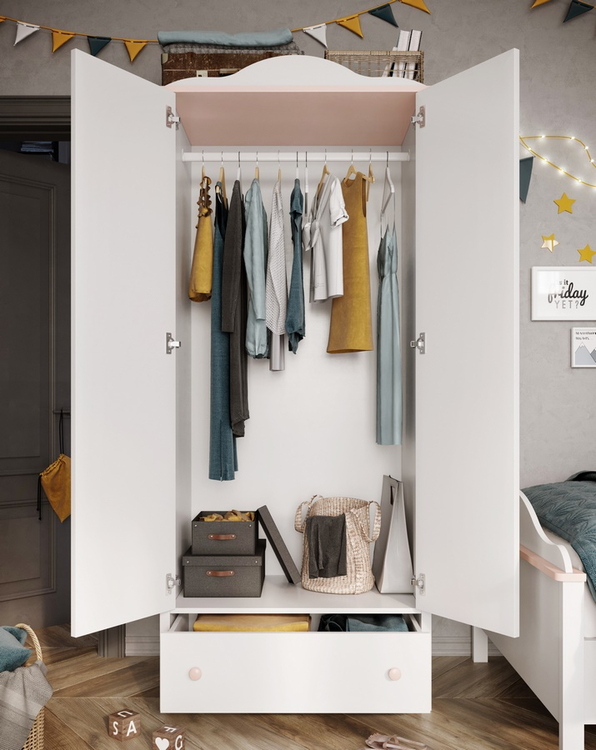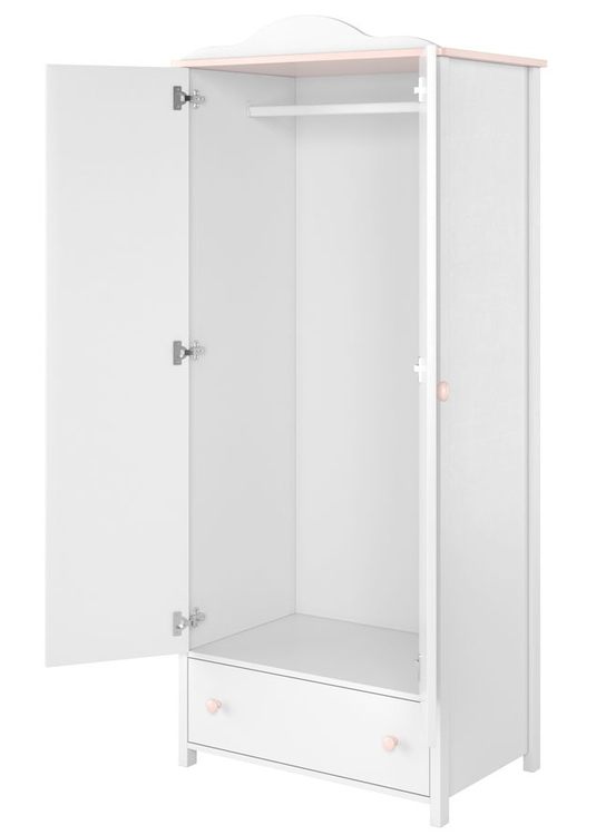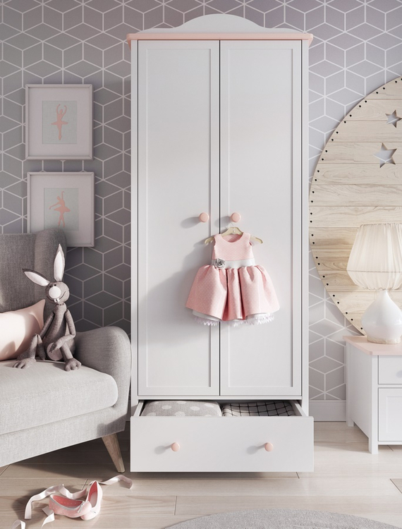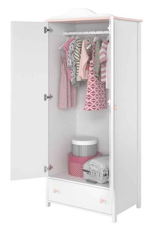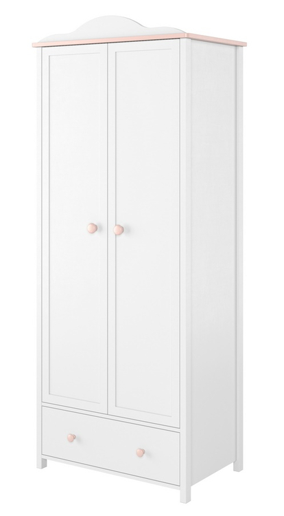 Dvoudveřová šatní skříň. Tento elegantní nábytek dodá romantickou atmosféru pokojíčku malé princezny i větší slečny. Skříň je vyrobena z desky LTD v barvě bílé s doplňkovou barvou růžovou. Uvnitř skříně je šatní tyč. Ve spodní části je prostorná zásuvka. Úchyty jsou plastové v růžové barvě.... více informací o zboží
