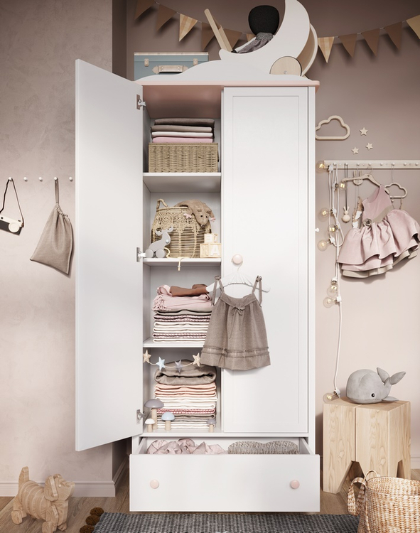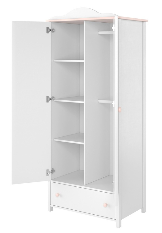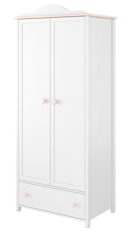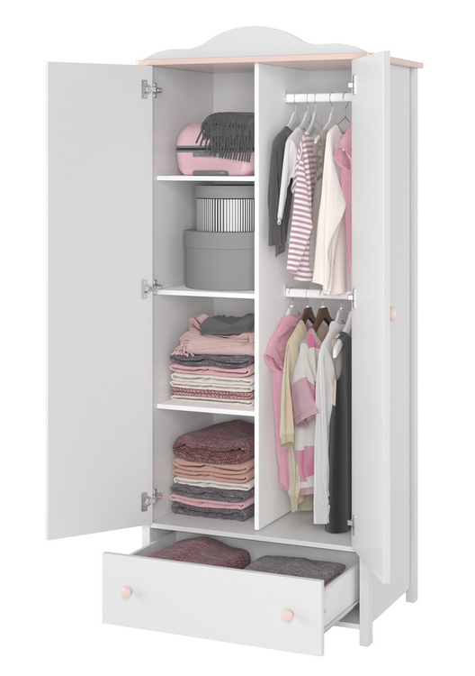 Dvoudveřová šatní skříň se zásuvkou. Tento elegantní nábytek dodá romantickou atmosféru pokojíčku malé princezny i větší slečny. Skříň je vyrobena z desky LTD v barvě bílé s doplňkovou barvou růžovou. Uvnitř skříně jsou 2 šatní tyče nad sebou v pravé části a v levé části skříně jsou police. Ve spodní části skříně je zásuvka. Úchyty jsou plastové v růžové barvě. Dodáváme v demontovaném stavu.CASA 73019