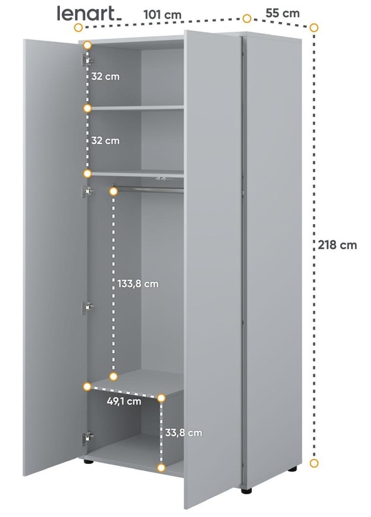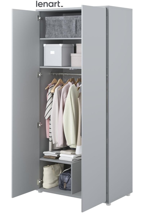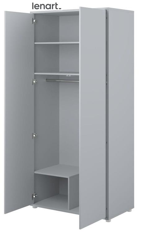 Šatní skříň se dvěma dvířky šedá. Rozměry a vnitřní prostor viz obrázky. Nábytek je vyroben z kvalitního lamina s ABS hranou. Lamino je odolné proti poškrábání, poškození, vlhkosti a vysokým teplotám. Dodáváme v demontovaném stavu.CASA 73026