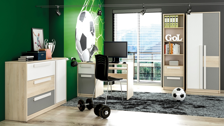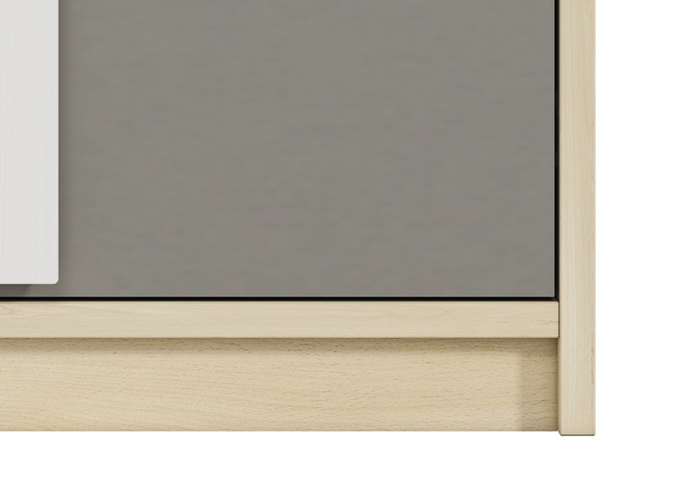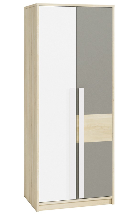 Šatní skříň dvoudveřová v moderním provedení. Korpus je vyroben z kvalitní desky LTD hraněné ABS páskou v barvě buk fjord, dvířka jsou vyrobeny z desky LTD v kombinaci barev buk fjord/bílá/šedá. V levé části skříně jsou dvě šatní tyče nad sebou, pravá část je vybavena policemi. Úchyty jsou... více informací o zboží