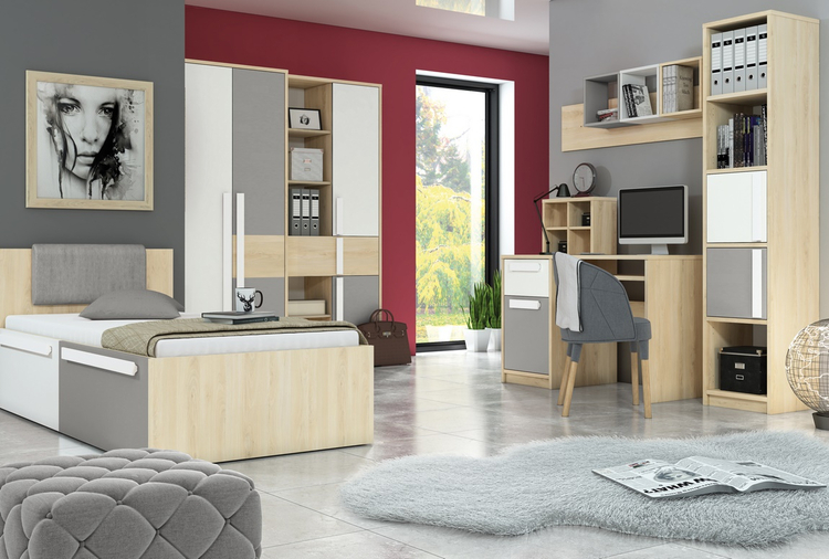 Šatní skříň dvoudveřová v moderním provedení. Korpus je vyroben z kvalitní desky LTD hraněné ABS páskou v barvě buk fjord, dvířka jsou vyrobeny z desky LTD v kombinaci barev buk fjord/bílá/šedá. V levé části skříně jsou dvě šatní tyče nad sebou, pravá část je vybavena policemi. Úchyty jsou dřevěné bílé. Dodáváme v demontovaném stavu.CASA 56010