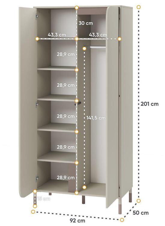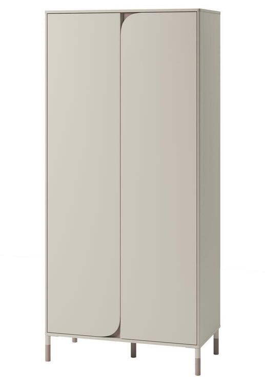 Skříň šatní dvoudveřová. Nábytek pro teenagery, který díky něžnosti hlavně ocení divky, nabízí moderní a praktické řešení do pokojů. Kombinace kašmírové a lanýžové barvy vytváří elegantní a univerzální design. Vyniká zaoblenými čely, asymetrickým stylem a štíhlými nožkami, které dodávají lehký vzhled. Vyroben je z odolné laminované desky o tloušťce 16 mm, zadní stěna je z HDF desky o tloušťce 3 mm. Jemné úchyty jsou kuličkové vyrobené z plastu. Ideální volba pro stylový a funkční prostor. Dodáváme v demontovaném stavu.CASA 73041