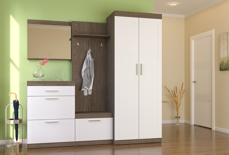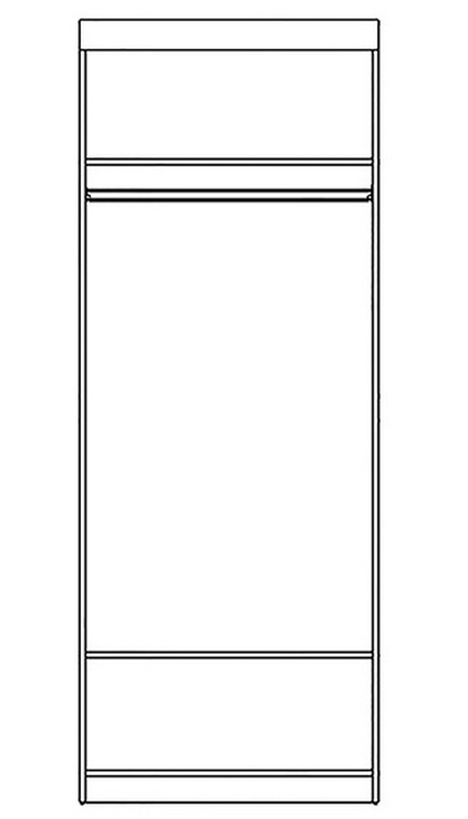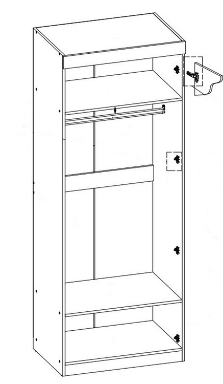 Šatní skříň dvoudveřová. Korpus je vyroben z desky LTD v barvě bergamo jilm, dvířka jsou vyrobeny z desky MDF v barvě bílá lesk. Uvnitř skříně je šatní tyč a police – viz. perokresba. Dodáváme v demontovaném stavu.DOPRODEJ!CASA 52014