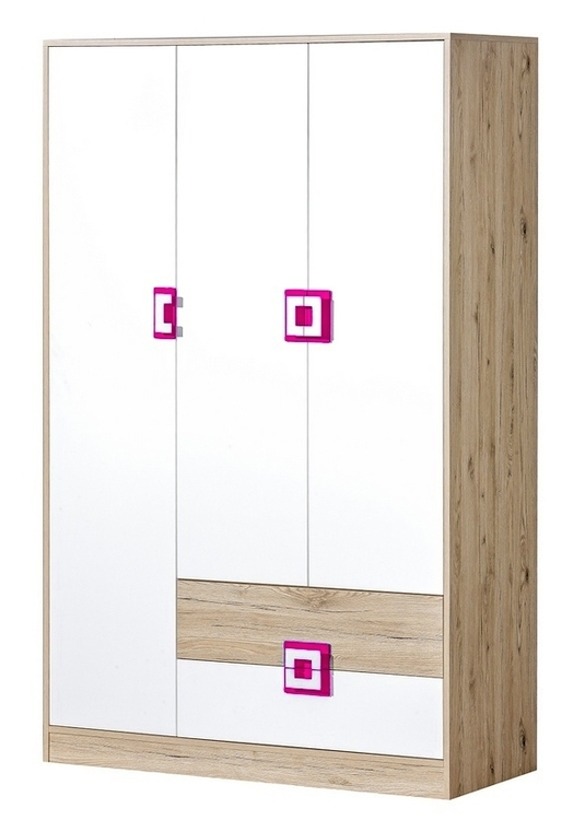 Třídveřová šatní skříň NIKO ze sektorové řady, která se vyznačuje netradičním zpracováním barev a originalitou úchytů. Tento styl nábytku zaujme každou mladší generaci. Skříň je vyrobena z kvalitní LTD desky hraněné ABS lištou. Korpus je v barvě dub jasný, dveře jsou v kombinaci barev bílá mat / dub jasný. Úchytky jsou v barevné kombinaci růžová / bílá. Uvnitř skříně vpravo je šatníková tyč a v dolní části jsou 2 zásuvky. V levé části skříně jsou umístěny čtyři police. Sektorový nábytek NIKO má široký výběr prvků, který Vám zaručí sestavit si dětský nebo studentský pokoj, ložnici či kancelář podle svých potřeb, přání a představ. Dodáváme v demontovaném stavu.CASA 23004