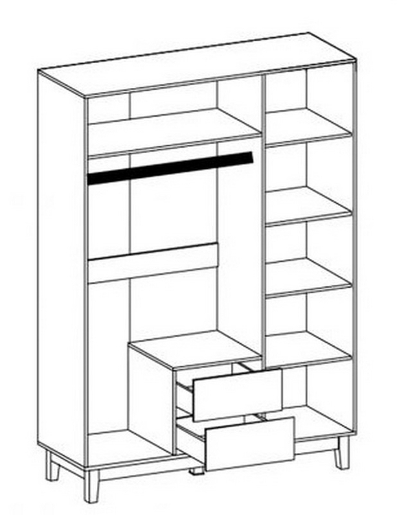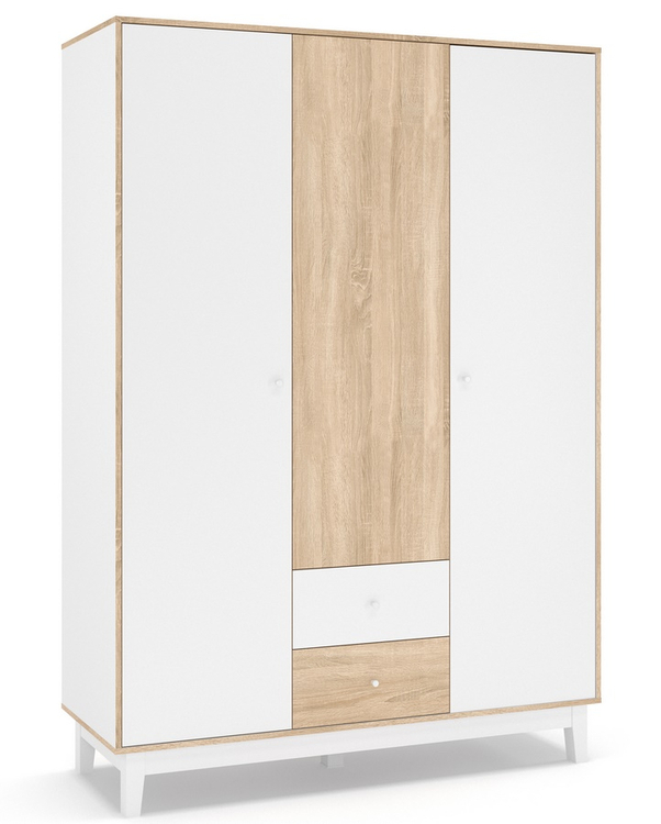 Šatní skříň třídveřová v moderním provedení v jemných barvách. Nábytek je vyroben z kvalitní LTD desky v barevné kombinaci bílá/dub sonoma. V levé části skříně je šatní tyč, nad ní police a ve spodní části jsou dvě zásuvky, v pravé části jsou 4 police. Dodáváme v demontovaném stavu.CASA 97032