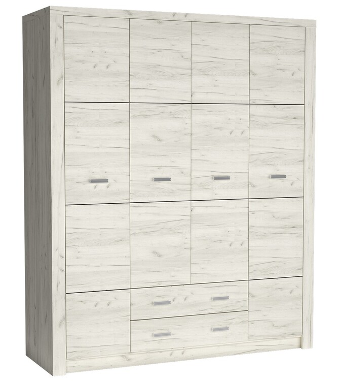 Kombinovaná šatní skříň ze sektorové řady. Skříň má 4 dveře a 2 zásuvky. V prostření části skříně je uvnitř skříně šatní tyč a nahoře jedna polička. Po bocích jsou skříně s šatní tyčí a poličkou nahoře i dole. Systém je exkluzivní kolekce navržena v moderním duchu. Celá řada se vyznačuje elegancí a jednoduchými tvary, které zaručují plné využití prostoru. Nábytek je vyroben z kvalitního lamina s ABS hrany ( 0,5–0,8 mm ). Barevné provedení jasan bílý. Dodáváme v demontovaném stavu.CASA 71007