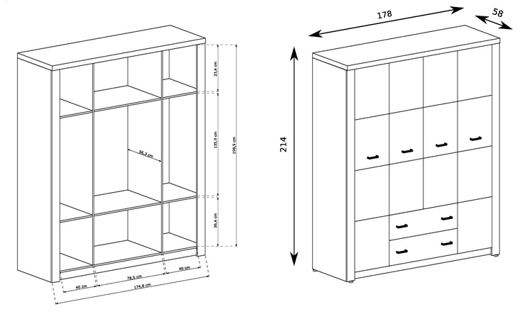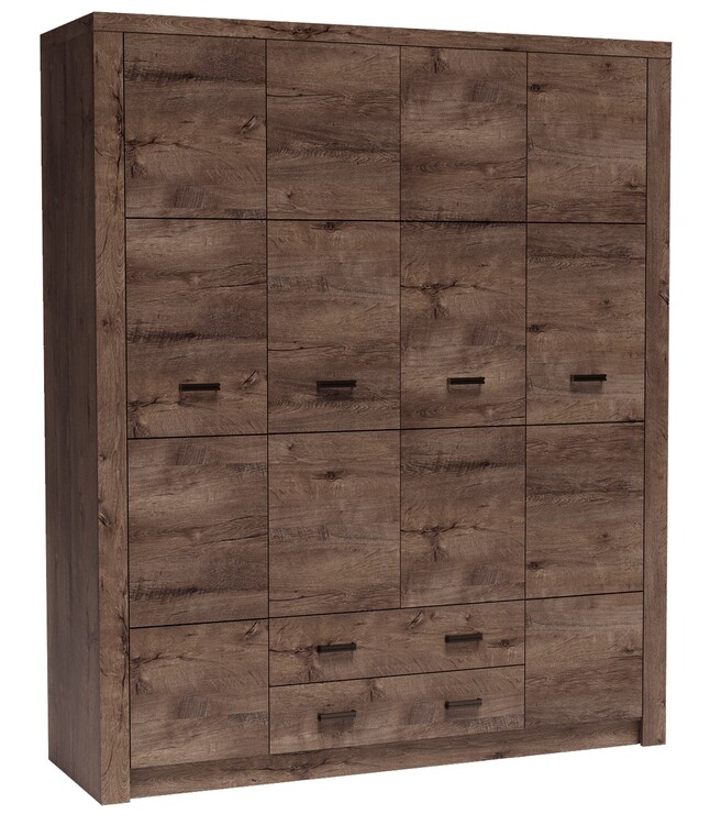 Kombinovaná šatní skříň. Skříň má 4 dveře a 2 zásuvky. V prostření části skříně je uvnitř skříně šatní tyč a nahoře jedna polička. Po bocích jsou skříně s šatní tyčí a poličkou nahoře i dole. Systém je exkluzivní kolekce navržena v moderním duchu. Celá řada se vyznačuje elegancí a jednoduchými tvary, které zaručují plné využití prostoru. Nábytek je vyroben z kvalitního lamina s ABS hrany ( 0,5–0,8 mm ). Barevné provedení jasan tmavý. Dodáváme v demontovaném stavu.CASA 71007