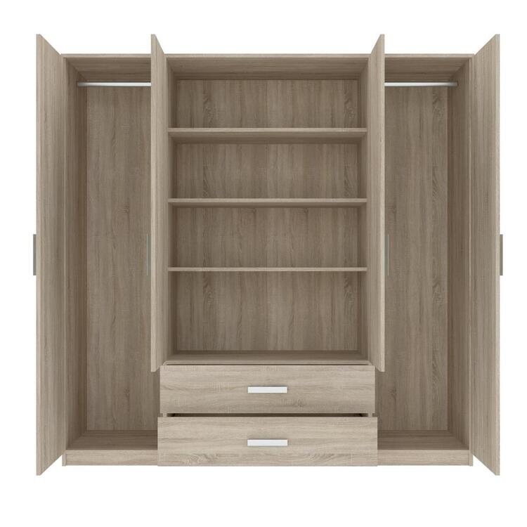 Šatní skříň čtyřdveřová se dvěma zásuvkami, je vyrobena z kvalitní LTD desky v barevném provedení dub sonoma. Uvnitř skříně jsou dvě šatní tyče po stranách a uprostřed policový systém, dveře jsou doplněny zrcadlem. V naší nabídce naleznete více variant nábytku této řady. Dodáváme v... více informací o zboží