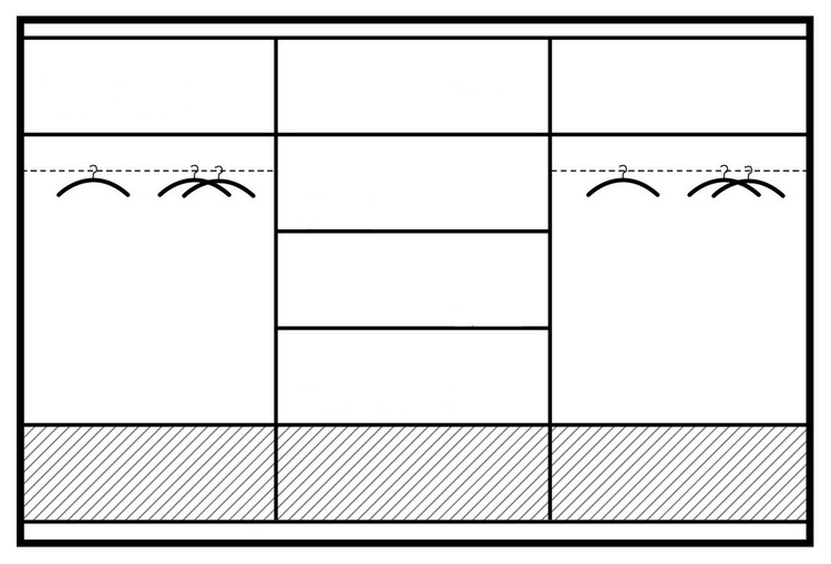 Šatní skříň s třemi posuvnými dveřmi v moderním provedení. Prostřední část je policová, krajní mají šatní tyč. Korpus je z kvalitního LTD v barvě ořech. Dveře jsou ze skla v bílé barvě a prostřední dveře jsou ze zrcadla. Skříň má dole tři praktické zásuvky. Uspořádání polic viz. perokresba.... více informací o zboží