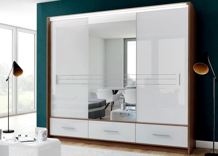 Šatní skříň s třemi posuvnými dveřmi v moderním provedení. Prostřední část je policová, krajní mají šatní tyč. Korpus je z kvalitního LTD v barvě ořech. Dveře jsou ze skla v bílé barvě a prostřední dveře jsou ze zrcadla. Skříň má dole tři praktické zásuvky. Uspořádání polic viz. perokresba. Otevírání pomocí kvalitního systému SEVROLL. Elegantní LED osvětlení je v ceně. Dodáváme v demontovaném stavu.CASA 31001