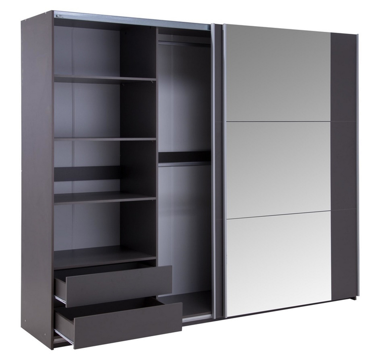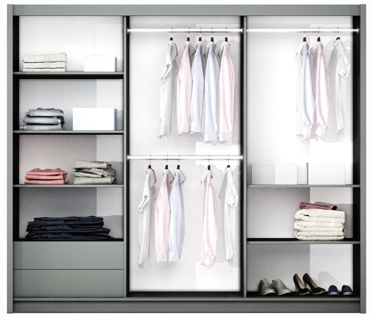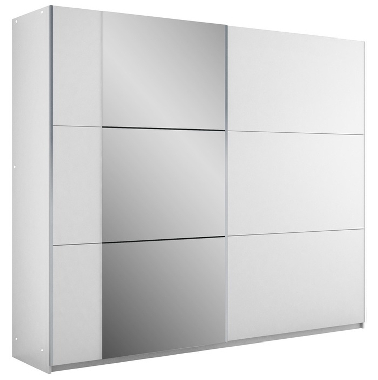 Šatní skříň s posuvnými dveřmi v moderním provedení vhodná do monochromatického interiéru. Korpus i dvířka jsou z kvalitní LTD desky bílé barvy. Dveře jsou v barvě bílé doplněné zrcadlem. Uspořádání polic viz. obrázek. Dodáváme v demontovaném stavu.CASA 31006