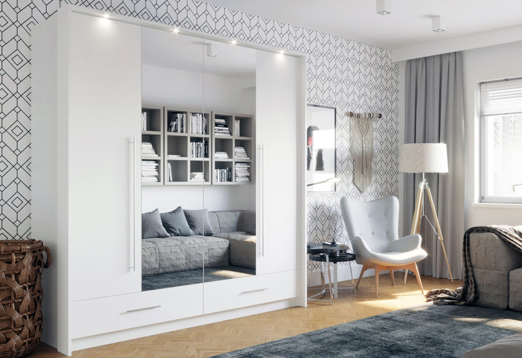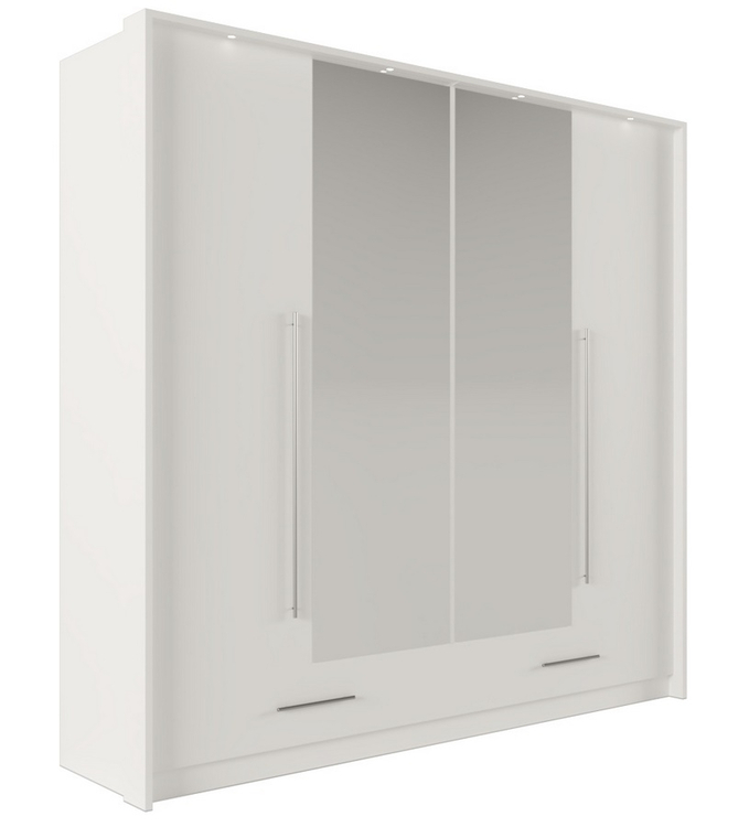 Šatní skříň s křídlovými shrnovacími dveřmi v moderním provedení. Výhodou tohoto systému dveří je volný přístup do celé skříně. Otvírání dveří zabezpečují hliníkové pojezdy Hettich. Korpus je vyroben z kvalitní LTD desky bílé barvy. Dveře jsou v barvě bílé doplněné zrcadlem. Ve spodní části skříně jsou dvě hluboké zásuvky. Skříň obsahuje praktické LED osvětlení v ceně. Uspořádání polic viz. obrázek. Dodáváme v demontovaném stavu.CASA 31078