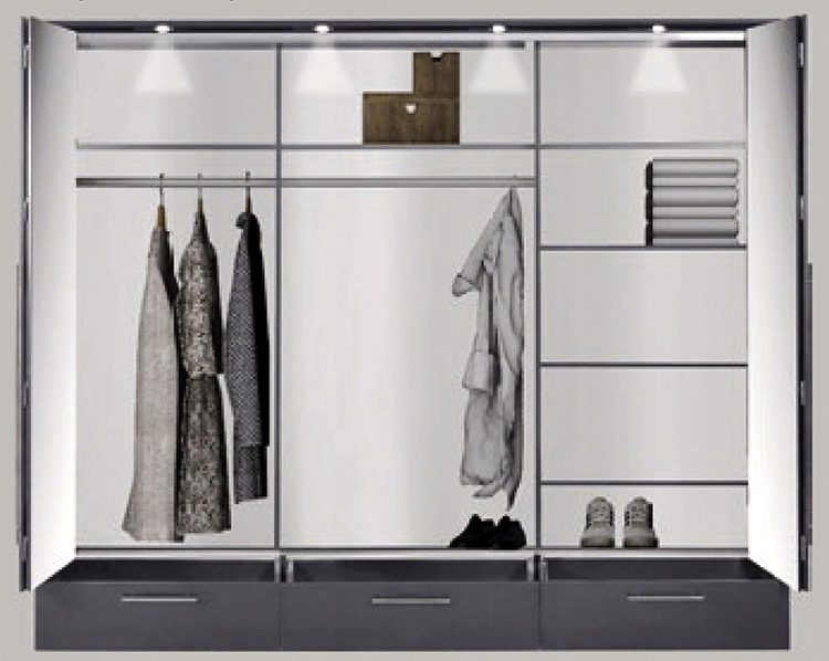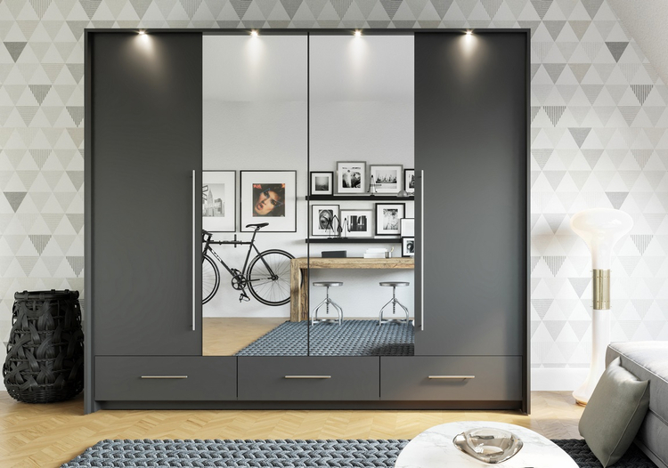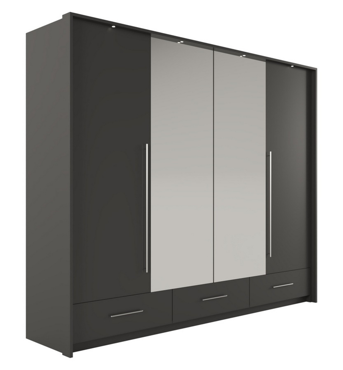 Šatní skříň s křídlovými shrnovacími dveřmi v moderním provedení. Výhodou tohoto systému dveří je volný přístup do celé skříně. Otvírání dveří zabezpečují hliníkové pojezdy Hettich. Korpus je vyroben z kvalitní LTD desky v barvě grafit. Dveře jsou v barvě grafit doplněné zrcadlem. Ve spodní části skříně jsou tři hluboké zásuvky. Skříň obsahuje praktické LED osvětlení v ceně. Uspořádání polic viz. obrázek. Dodáváme v demontovaném stavu.CASA 31078
