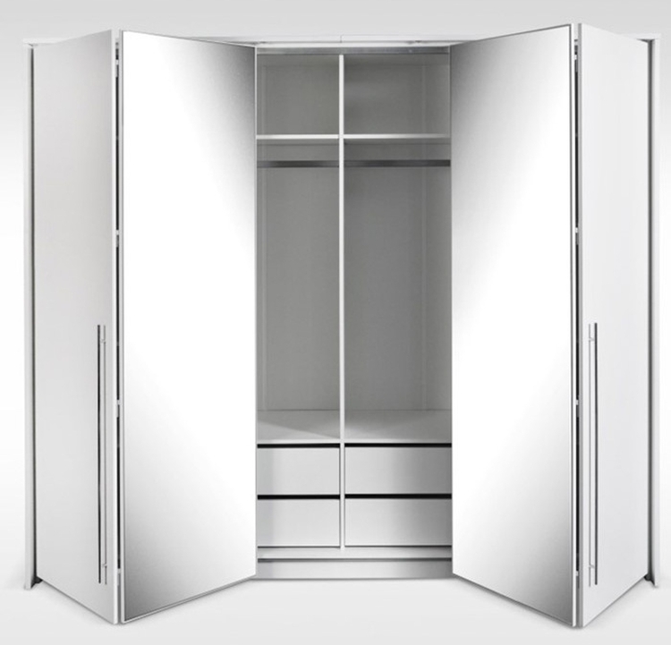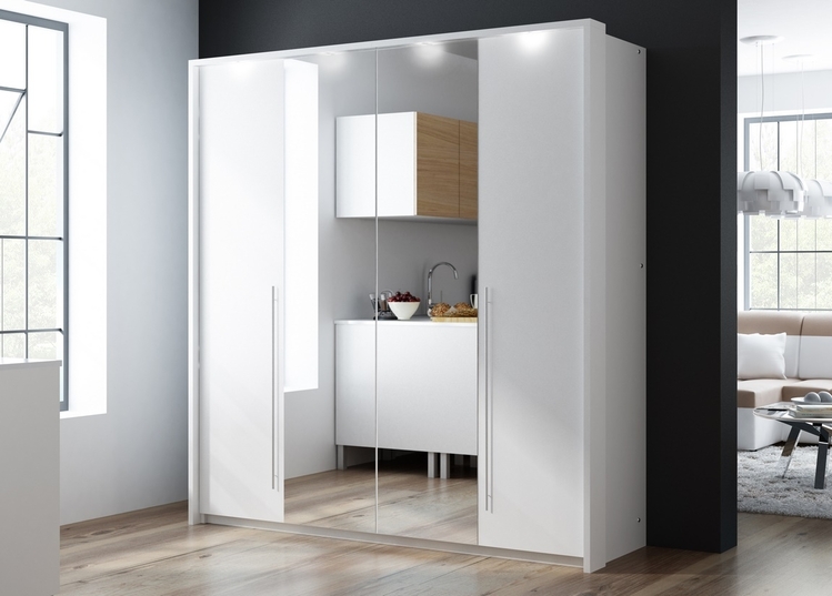 Šatní skříň s křídlovými shrnovacími dveřmi v moderním provedení. Výhodou tohoto systému dveří je volný přístup do celé skříně. Korpus je z kvalitní LTD desky bílé barvy. Dveře jsou v barvě bílé doplněné zrcadlem. Skříň obsahuje praktické LED osvětlení v ceně. Uspořádání polic viz. obrázek.... více informací o zboží