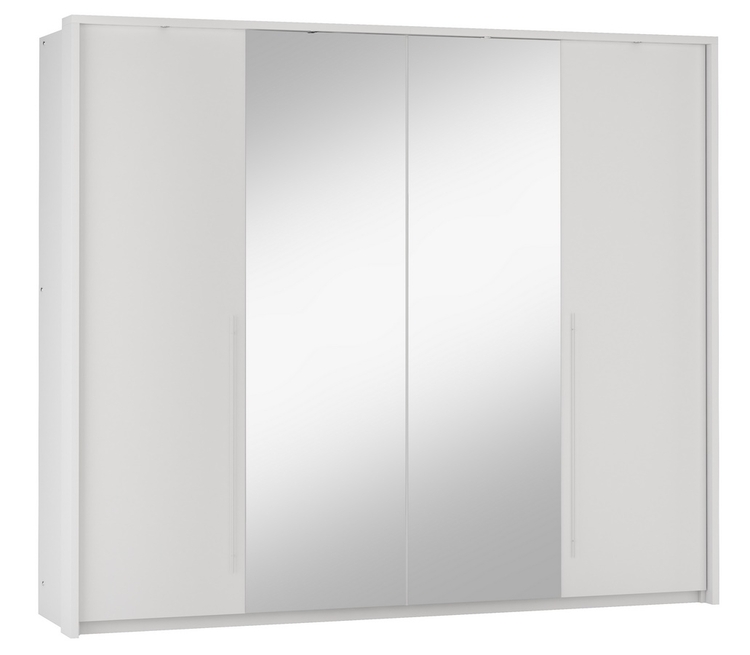 Šatní skříň s křídlovými shrnovacími dveřmi v moderním provedení. Výhodou tohoto systému dveří je volný přístup do celé skříně. Korpus je z kvalitní LTD desky bílé barvy. Dveře jsou v barvě bílé doplněné zrcadlem. Skříň obsahuje praktické LED osvětlení v ceně. Uspořádání polic viz. obrázek.... více informací o zboží