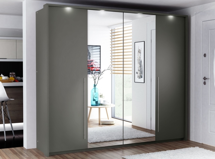 Šatní skříň s křídlovými shrnovacími dveřmi v moderním provedení. Výhodou tohoto systému dveří je volný přístup do celé skříně. Korpus je z kvalitní LTD desky v barvě láva. Dveře jsou v barvě láva doplněné zrcadlem. Skříň obsahuje praktické LED osvětlení v ceně. Uspořádání polic viz. obrázek.... více informací o zboží