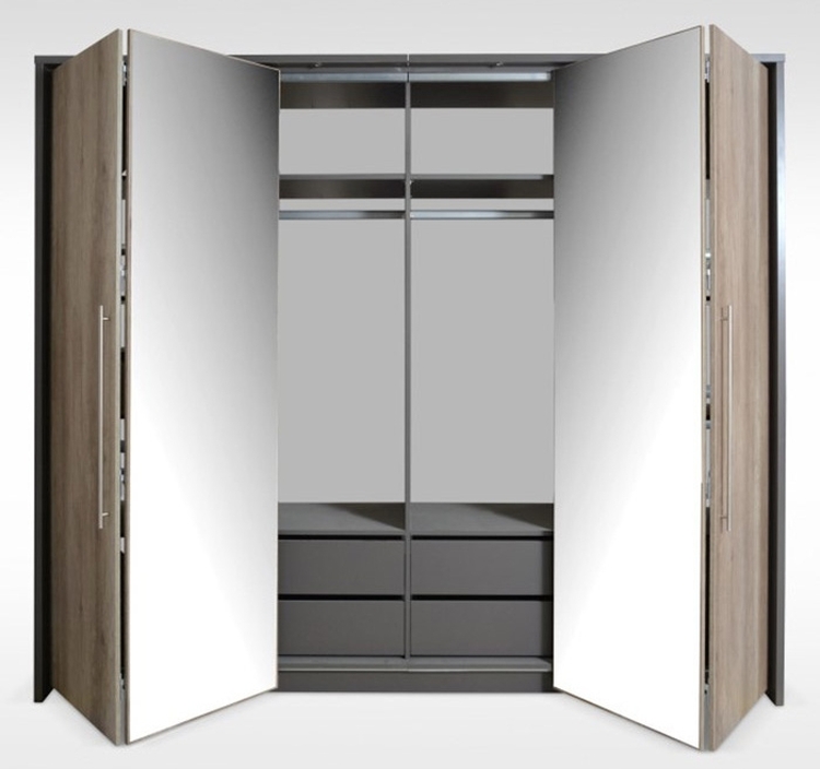 Šatní skříň s křídlovými shrnovacími dveřmi v moderním provedení. Výhodou tohoto systému dveří je volný přístup do celé skříně. Korpus je z kvalitní LTD desky v barvě láva. Dveře jsou v barvě láva doplněné zrcadlem. Skříň obsahuje praktické LED osvětlení v ceně. Uspořádání polic viz. obrázek. Dodáváme v demontovaném stavu.CASA 31011
