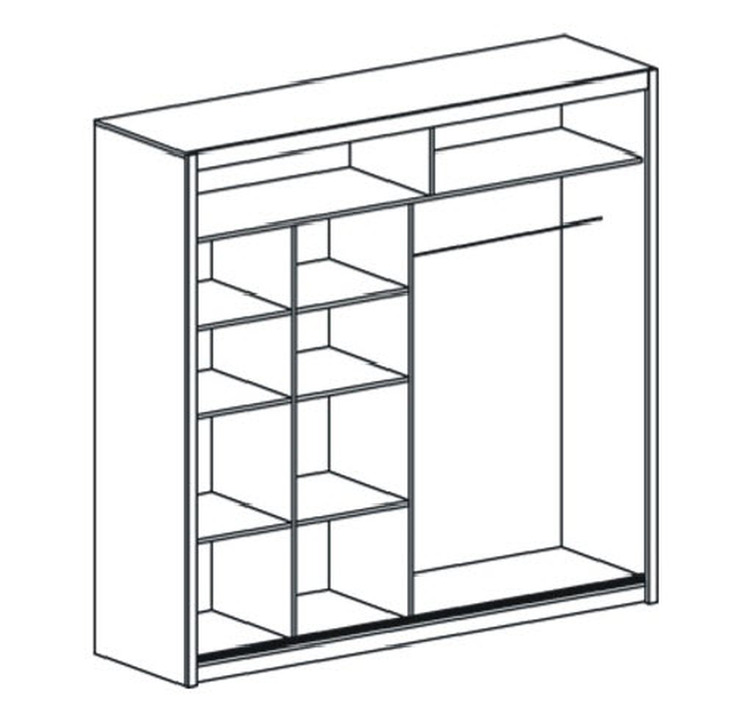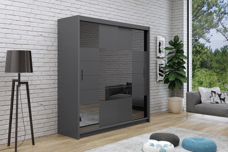 Šatní skříň s posuvnými dveřmi v moderním provedení, které nikdy není monotónní nebo nudné. Korpus i dvířka jsou z kvalitní LTD desky grafitové barvy. Dveře jsou dekorovány grafitovým zrcadlem. Uspořádání polic viz. perokresba. Dodáváme v demontovaném stavu.CASA 31002
