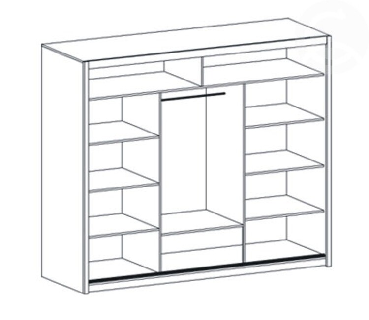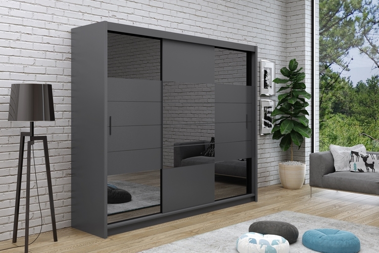 Šatní skříň s posuvnými dveřmi v moderním provedení, které nikdy není monotónní nebo nudné. Korpus i dvířka jsou z kvalitní LTD desky grafitové barvy. Dveře jsou dekorovány grafitovým zrcadlem. Uspořádání polic viz. perokresba. Dodáváme v demontovaném stavu.CASA 31002