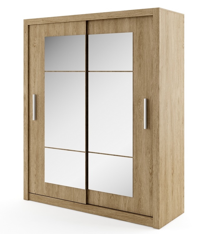 Šatní skříň s posuvnými dveřmi v moderním provedení. Korpus z kvalitního LTD je v barvě dub shetland . Dveře jsou osazeny zrcadlem. Uspořádání polic viz. menší obrázek. Hrany u skříně jsou ohraničeny ABS páskou a skříň má hliníkové pojezdy. Možnost dokoupení praktického kontejneru se... více informací o zboží