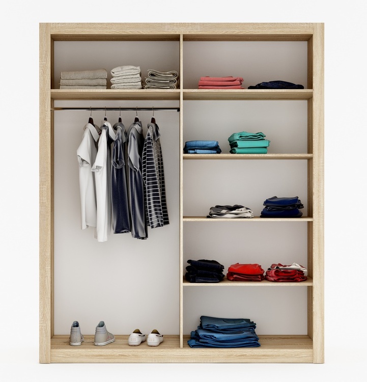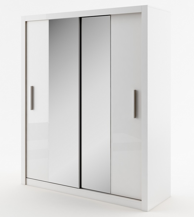 Šatní skříň s posuvnými dveřmi v moderním provedení. Korpus z kvalitního LTD je v bílé matné barvě. Dveře jsou osazeny uprostřed zrcadlem a LTD je po bocích. Uspořádání polic viz. menší obrázek. Hrany u skříně jsou ohraničeny ABS páskou a skříň má hliníkové pojezdy. Možnost dokoupení... více informací o zboží