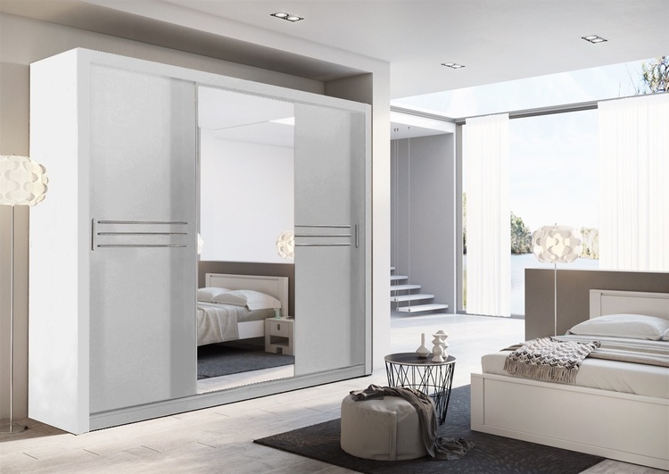 Šatní skříň se 3 posuvnými dveřmi v moderním provedení. Korpus a dveře z kvalitního LTD jsou v bílé matné barvě. Prostřední dveře jsou osazeny zrcadlem. Uprostřed dveří je dekor ze tří vodorovných čar. Uspořádání polic viz. menší obrázek. Hrany u skříně jsou ohraničeny ABS páskou a skříň má... více informací o zboží