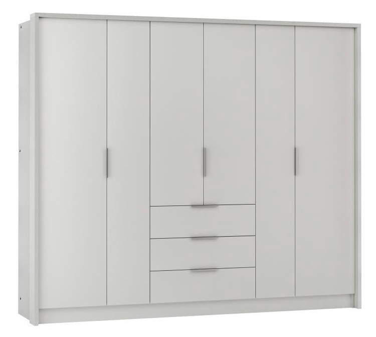 Šatní skříň se třídveřová v moderním provedení. Korpus je z kvalitní LTD desky v barvě bílá. Skříň má ve středové části tři zásuvky. Uspořádání polic viz. obázek. Dodáváme v demontovaném stavu.CASA 31079